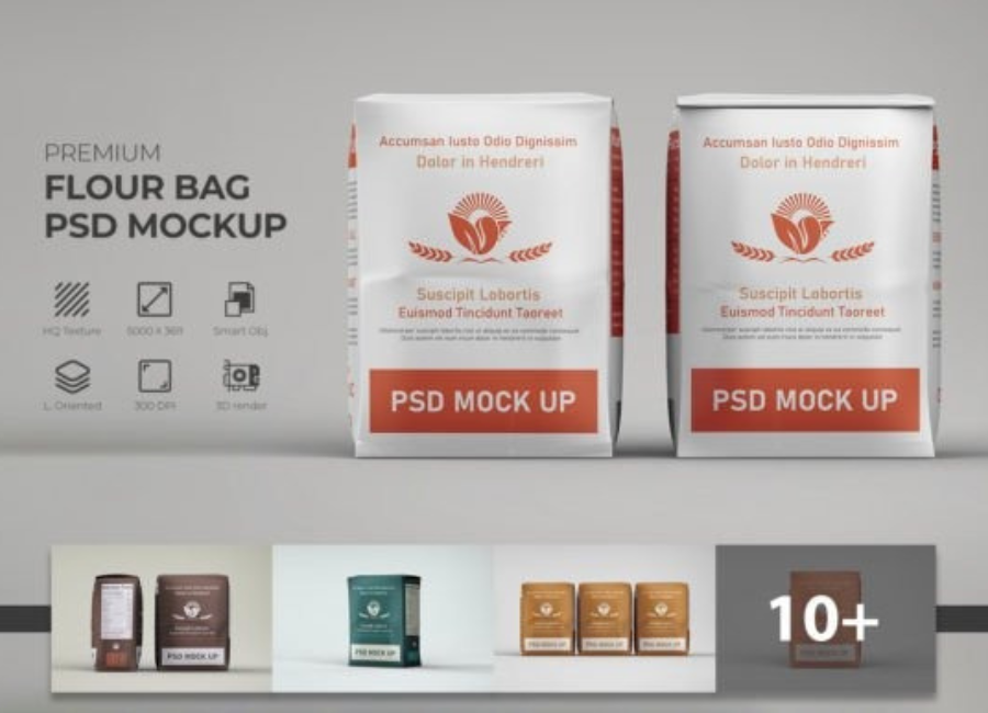 High-quality flour bag mockups are designed for flexibility and realism. Common features include: