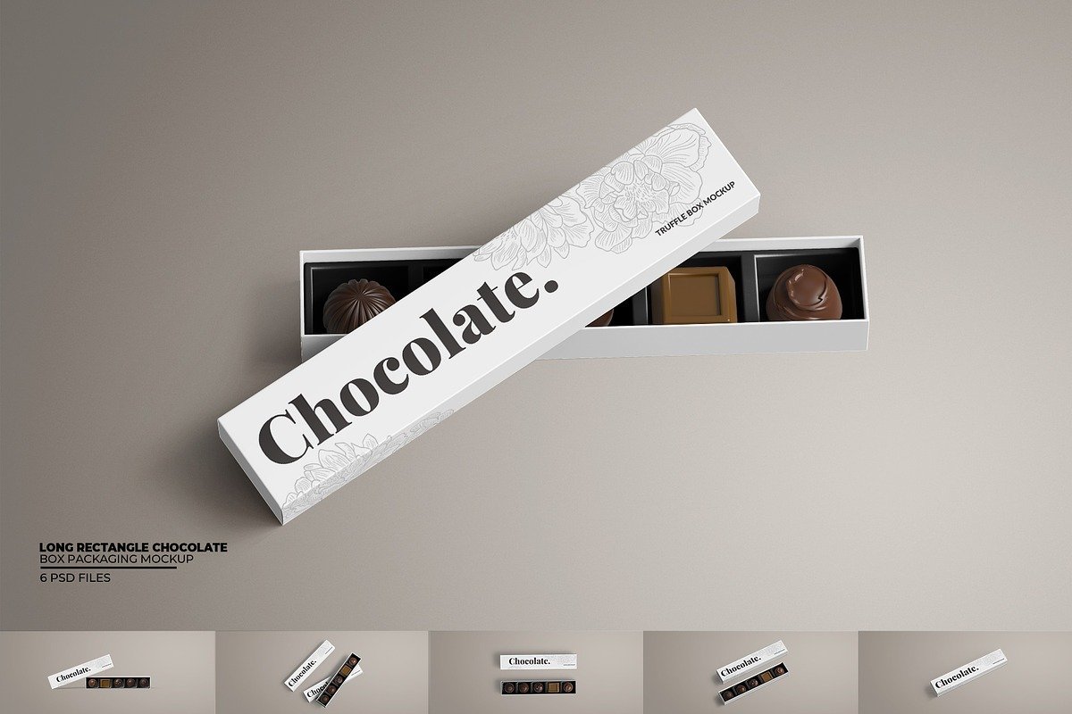 A long rectangle chocolate box mockup is a digital template — typically in PSD (Photoshop) or 3D format — that shows a chocolate box with a long, horizontal rectangular shape. This shape is especially suitable for packaging chocolate bars, chocolate sticks, artisanal chocolate assortments, and other elongated confectionery items. The mockup simulates realistic shadows, lighting, proportions, and material textures so that your design doesn’t look flat or artificial.