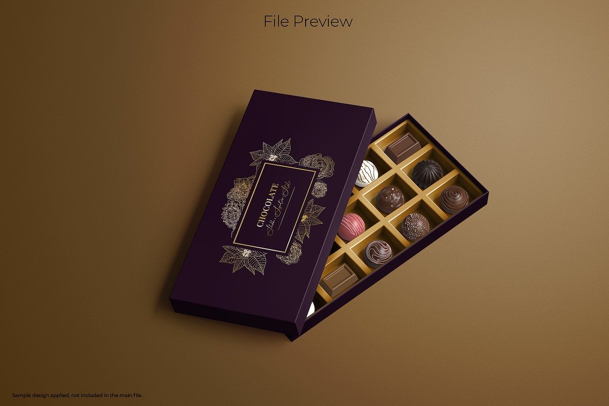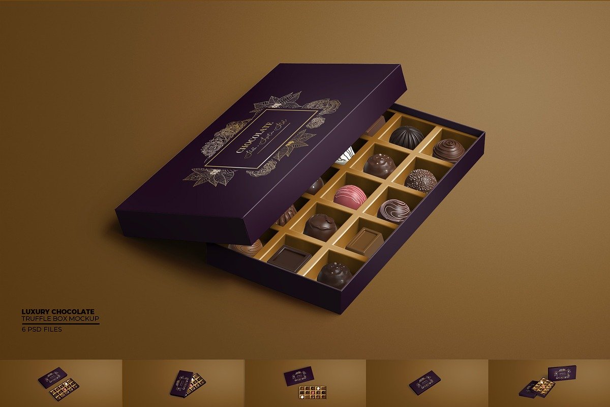 For example, a luxury truffle box mockup on Creative Market showcases a high-resolution, photorealistic representation of a premium box with editable backgrounds and shadow layers — ideal for reflecting the high-end positioning of a chocolate brand.