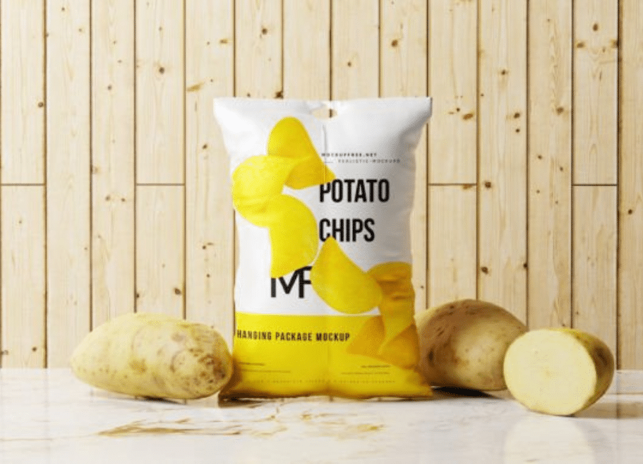 Potato Chips Bag Mockup with Potatoes From a design perspective, these mockups also enhance composition, making packaging visuals more dynamic and engaging.
